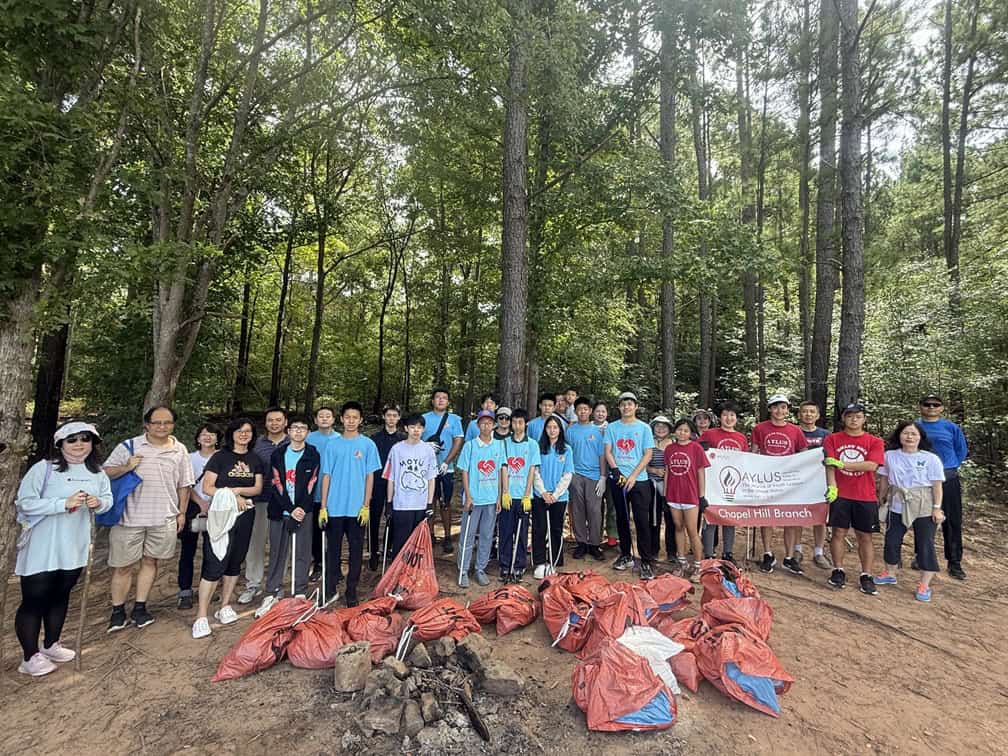 On August 24, 2025, about 35 volunteers from the CAFA Youth Volunteer group and AYLUS Chapel Hill branch returned to Jordan Lake near Apex, NC, for their regular cleanup. From 10:30 AM to 12:00 PM, youth and parents worked together to clear trash along the lakeshore after a long summer season.